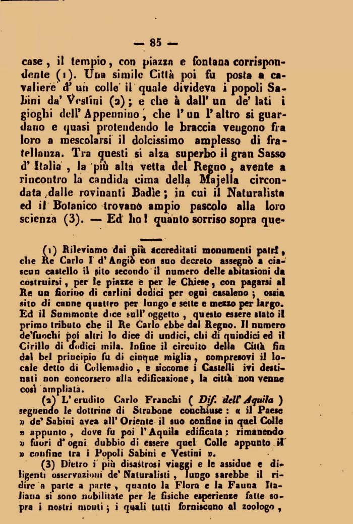 case, il tempio, con piazza e fontana corrispondente (i). Una simile Città poi fu posta a cavaliere d' un colle il quale divideva i popoli Sabini da' Vestini (a) ; e che a dall' un de' lati i gioghi dell'Appennino, che 1'un l'altro si guardano e quasi protendendo le braccia veugono fra loro a mescolarsi il dolcissimo amplesso di fratellanza. Tra questi si alza superbo il gran Sasso d* Italia , la più alta vetta del Regno , avente a rincontro la candida cima della Majella circondata .dalle rovinanti Badìe; in cui il Naturalista ed il Botanico trovano ampio pascolo alla loro scienza (3). — Ed Ito! quanto sorriso sopra que-
