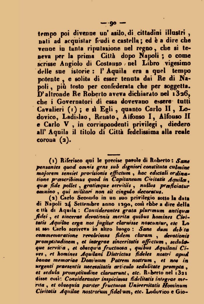 tempo poi divenne un'asilo, di cittadini illustri , nati ad acquistar feudi e castella; ed e a dire che venne in tanta riputazione nel regno, che si teneva per la prima Città dopo Napoli ; o come scrisse Angiolo di Costatilo / nel Libro vigesimo delle sue istorie : I' Aquila era a quel tempo potente , e solita di esser tenuta dai Re di Napoli , piò tosto per confederata che per soggetta. D'altronde Re Roberto aveva dichiarato nel i3a6; che i Governatori di essa dovevauo essere tatti Cavalieri (i) ; e si Egli , quanto Carlo II, Lodovico, Ladislao, Renato, Alfonso I, Alfonso II e Carlo V , in corrispondenti privilegi , diedero air Aquila il titolo di Città fedelissima alla reale corona (a).