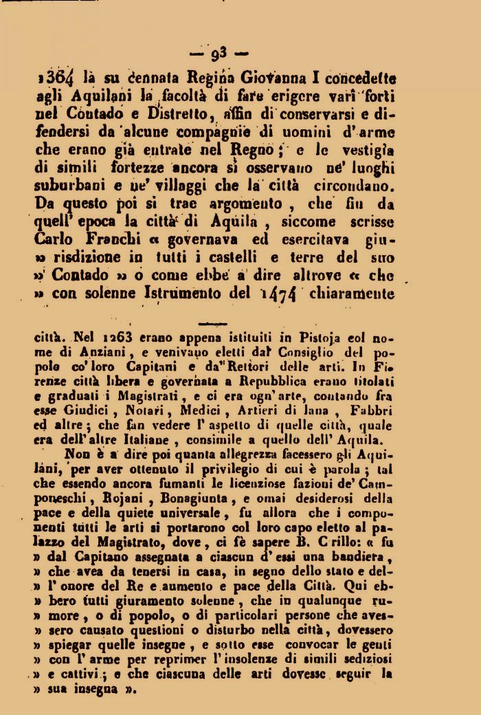 >364 lą su bennata Regina Giovanna I concedette agli Aquilani la .facoltą di fa^e erigere vari forti nel Contado e Distretto, alfin di conservarsi e difendersi da alcune compagnie di uomini d'arme che erano gią entrate nel Regnņ ; e le vestigia di simili fortezze ancora sģ osservano ne9 lunghi suburbani e uč9 villaggi che lą cittą circondano. Da questo poi si trae argomento , che fin da quell'epoca la cittą1 di Ąquila , siccome scrisse Carlo Franchi « governava ed esercitava giti -» risdizione in tutti i castelli e terre del sito Contado » o come ebbe a dire altrove t< che » con solenne Istrumento del 1474 chiaramente