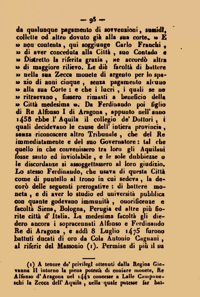 (i) A tenore de* privilegi ottenuti dalla Regina Giovanna li iutorno la piena potestà di coniare monete, Re Alfonso d'Aragona nel i^ji concesse a Lille Campone-schi la Zecca dell' Aquila , nella quale potesse iar bau
