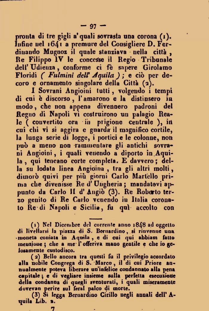 I Sovrani Angioini tutti , volgendo i tempi di cui è discorso, ramarono e la distinsero ia modo, che non appena divennero padroni del Regno di Napoli vi costruirono un palagio Reale ( convertito ora iti prigione centrale ), iti cui chi vi si aggira e guarda il magnifico cortile, la lunga serie di logge, i portici e le colonne, non può a meno non rammentare gli antichi sovra* ni Angioini, i quali venendo a diporto in .Aquila , qui tencano corte completa. E davvero; della su lodala linea Angioina , tra gli altri molti, dimorò quivi per più giorni Carlo Martello prima che divenisse Re d' Ungheria ; mandatovi appunto da Carlo II d' Àngiò (3). Re Roberto terzo genito di Re Carlo venendo iu Italia coronato Re di Napoli e Sicilia, fu qui accolto con