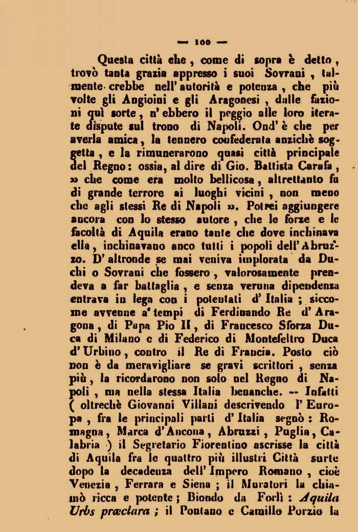 Questa città che , come di sopra è detto , trovò tanta grazia appresso i suoi Sovrani , talmente- crebbe nell' autorità e potenza , che più volte gli Angioini e gli Aragonesi , dalle fazioni qui sorte, n' ebbero il peggio alle loro iterate dispute sul trono di Napoli. Ond' è che per averla amica, la tennero confederata anziché soggetta , e la rimunerarono quasi città principale del Regno: ossia, al dire di Gio. Battista Carafa , x> che come era molto bellicosa, altrettanto fu di grande terrore ai luoghi vicini , non meno che agli stessi Re di Napoli ». Potrei aggiungere ancora con lo stesso autore , che le forze e le facoltà di Aquila erano tante che dove inchinava ella, inchinavano anco tutti i popoli dell' A bnu-zo. D'altronde se mai veniva implorata da Duchi o Sovrani che fossero , valorosamente prendeva a far battaglia , e senza veruna dipendenza entrava iu lega con i potentati d'Italia ; siccome avvenue a* tempi di Ferdinando Re d'Aragona , di Papa Pio II, di Francesco Sforza Duca di Milano c di Federico di Montefeltro Duca d'Urbino, contro il Re di Francia. Posto ciò non è da meravigliare se gravi scrittori , senza più , la ricordarono non solo nel Regno di Napoli , ma nella stessa Italia benanche. — Infatti ( oltreché Giovanni Villani descrivendo I' Europa , fra le principali parti d'Italia segnò : Romagna, Marca d'Ancona, Abruzzi, Puglia, Calabria ) il Segretario Fiorentino ascrisse la città di Aquila fra le quattro piti illustri Città surte dopo la decadeuza dell' Impero Romano , cioè Venezia , Ferrara e Siena ; il Muratori la chiamò ricca e potente ; Biondo da Forlì : Àquila Ui*bs preclara ; il Po ulano e Camillo Porzio la