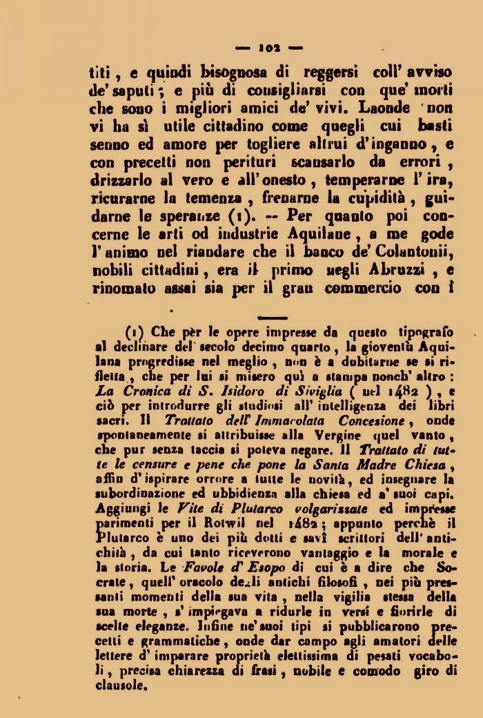 (i) Che pèr le opere impresse da questo tipografo al declinare del secolo decimo quarto, la gioventù Aquilana progredisse nel meglio , non è a dubitarne se si rifletta , che per lui si misero qui a stampa nonch' altro : La Cronica di S. Isidoro di Siviglia ( nel \lfio, ) , e ciò per introdurre gli studiosi ali1 intelligenza dei libri sacri. II Trattato delt Immacolata Concezione, onde spontaneamente si attribuisse alla Vergine quel vanto , che pur senza taccia si poteva negare. Il Trattato di tutte le censure e pene che pone la Santa Madre Chiesa , aflìn d'ispirare orrore a tutte le novità, ed insegnare la subordinazione ed ubbidienza alla chiesa ed a9 suoi capi. Aggiungi le File di Plutarco volgarizzate ed impresse parimenti per il Rotwil nel i£8a ; appunto percnè il Plutarco e uno dei piti dotti e savi scrittori dell' antichità , da cui tanto riceverono vantaggio e la morale e la storia. Le Favole cT Esopo di cui è a dire che So* crate, quelf oracolo de^li antichi filosofi , nei più pressanti momenti della sua vita , nella vigilia stessa della sua morte , s'impiegava a ridurle in versi e fiorirle di scelte eleganze. Infine ne'suoi tipi si pubblicarono precetti e grammatiche, onde dar campo agli amatori delle lettere d' imparare proprietà elettissima di pesati vocaboli , precisa chiarezza di frasi, nobile e comodo giro di clausole.