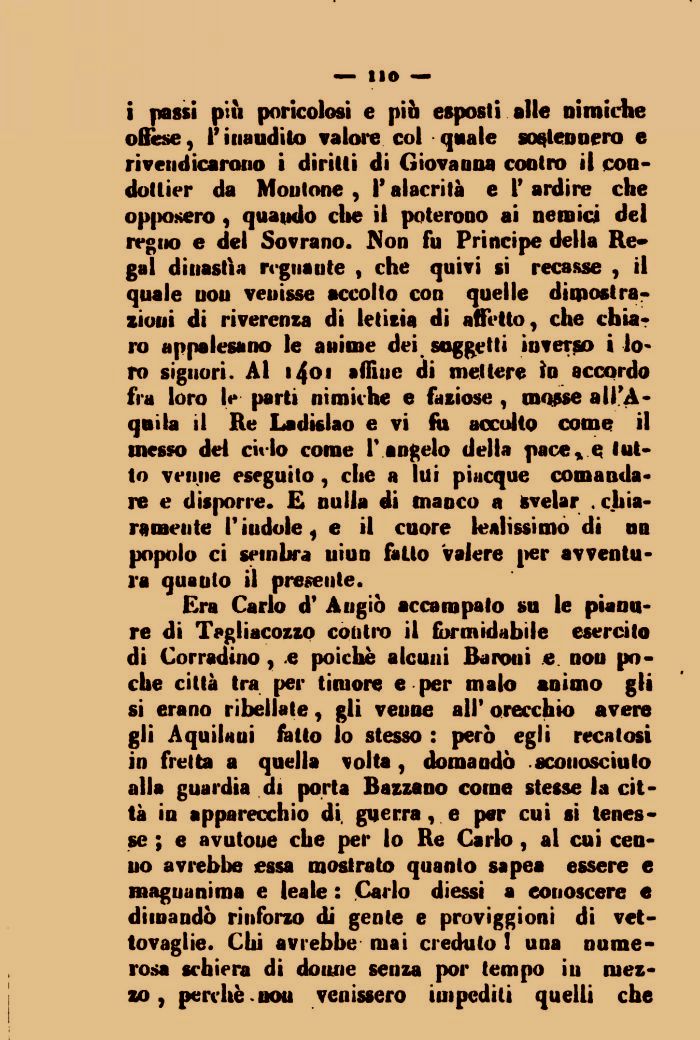 Era Carlo d' Angio accampato su le pianure di Tagliacozzo contro il formidabile esercito di Corredino, -e poiché alcuni Baroni e nou poche città tra per timore e per malo animo gli si erano ribellate, gli venne all' orecchio avere gli Aquilani fatto lo stesso : però egli recatosi in fretta a quella volta, doma odo sconosciuto alla guardia di porta Bazzano come stesse la città iu apparecchio di, guerra, e per cui si tenesse ; e avutone che per lo Re Carlo, al cui cenno avrebbe essa mostrato quanto sapea essere e magnanima e leale : Carlo diessi a conoscere e dimandò rinforzo di gente e proviggioni di vettovaglie. Chi avrebbe mai creduto ! una numerosa schiera di donne senza por tempo iu mezzo , petvhè nou venissero impediti quelli che
