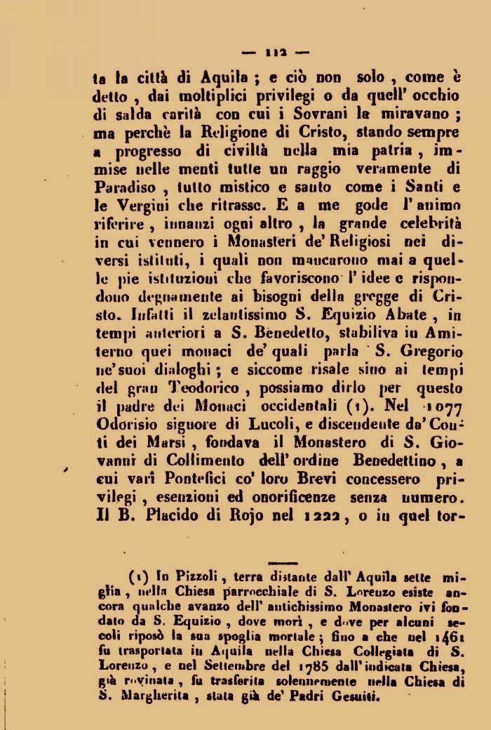 la la città di Àquila ; e ciò non solo , come è detto , dai moltiplici privilegi o da qucll' occhio di salda rarità con cui i Sovrani la miravano ; ma perchè la Religione di Cristo, stando sempre a progresso di civiltà nella mia patria , immise nelle menti tutte un raggio veramente di Paradiso , tutto mistico e santo come i Santi e le Vergiui che ritrasse. E a me gode V animo riferire , innanzi ogni altro , la grande celebrità in cui vennero i Monasteri de' Religiosi nei diversi istituti, i quali non maticurotio mai a quelle pie istituzioni che favoriscono l'idee e rispondono degnamente ai bisogni della gregge di Cristo. Infatti il zelantissimo S. Equi zio Abate , in tempi anteriori a S. Benedetto, stabiliva iu Ami-terno quei monaci de' quali parla S. Gregorio ne'suoi dialoghi ; e siccome risale sino ai tempi del gran Teodorico , possiamo dirlo per questo il padre dei Monaci occidentali (i). Nel 1077 Odorisio siguore di Lucoli, e discendente da' Coliti dei Marsi , fondava il Monastero di S. Giovanni di Collimento dell' ordine Benedettino , a cui vari Pontefici co' loro Brevi concessero privilegi , esenzioni ed onorificenze senza numero. Il B. Placido di Rojo nel 1222, o iu quel tor-