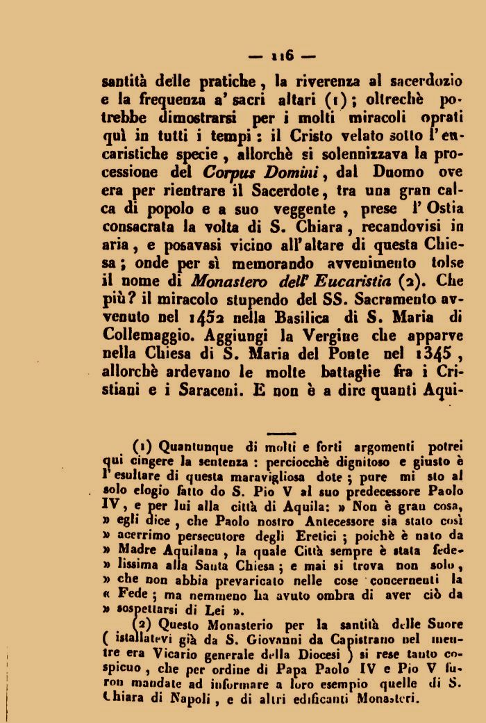 santità delle pratiche, la riverenza al sacerdozio e la frequenza a9 sacri altari (i); oltreché potrebbe dimostrarsi per i molti miracoli oprati qui in tutti i tempi : il Cristo velato sotto l'eucaristiche specie , allorché si solennizzava la processione del Corpus Domini, dal Duomo ove era per rientrare il Sacerdote, tra una gran calca di popolo e a suo veggente , prese 1' Ostia consacrata la volta di S. Chiara , recandovisi in aria, e posavasi vicino all'altare di questa Chiesa ; onde per sì memorando avvenimento tolse il nome di Monastero delF Eucaristia (a). Che più? il miracolo stupendo del SS. Sacramento avvenuto nel i45a nella Basilica di S. Maria di Collemaggio. Aggiungi la Vergine che apparve nella Chiesa di S. Maria del Ponte nel i345 , allorché ardevano le molte battaglie fra i Cristiani e i Saraceni. E non è a dire quanti Aqui-