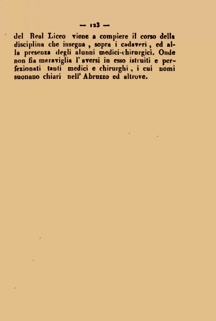 del Rea! Liceo viene a compiere il corso della disciplina che insegna , sopra i cadaveri , ed alla presenza degli alunni medici-chirurgici. Onde non fìa meraviglia V aversi in esso istruiti e perfezionati tanti medici e chirurghi , i cui nomi suonano chiari nell' Abruzzo ed altrove.