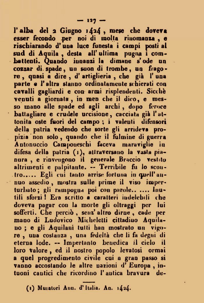 l'alba del a Giugno > doveva esser fecondo per noi di molta rinomanza , e rischiarando d'una luce funesta i campi posti al sud di Aquila , desta all' ultima pugna i combattenti. Quando iunanzi la dimane s'ode un cozzar di. spade, un suon di trombe, un fragore , quasi a dire , d' artiglieria , che già I' una parte e l'altra stanno ordinatamente schierati con cavalli gagliardi e con armi risplendenti. Sicché venuti a giornata , in men che il diro, e messo mano alle spade ed agli archi , dopo feroce battagliare e crudele uccisione, cacciata già l'attonita oste fuori del campo ; i valenti difensori della patria vedendo che sorte gli arrideva propizia non solo, quando che il fulmine di guerra Antonuccio Campoueschi faceva maraviglie in difesa della patria (i), attraversano la vasta pianura , e rinvengono il generale Braccio vestito altrimenti e palpitante. — Terribile fu Io scontro..... Egli cui tanto arrise lori una in quell'annuo assedio , mostra sulle prime il viso imper* turbato; gli rampogna poi con parole......Inutili sforzi ! Era scritto a caratteri indelebili che doveva pagar con la morte gli oltraggi per lui sofferti. Che perciò, senz'altro dime, cade per mano di Ludovico Miclieletti cittadino Aquilano ; e gli Aquilani tutti han mostrato un vigore , uua costanza , una fedeltà che li fa degni di eterna lode. — Impertanlo benedica il cielo il loro Valore , ed il nostro popolo levatosi ormai a quel progredimento civile cui a gran passo si vanno accostando le altre nazioni d' Europa , intuoni cantici che ricordino V antica bravura de-