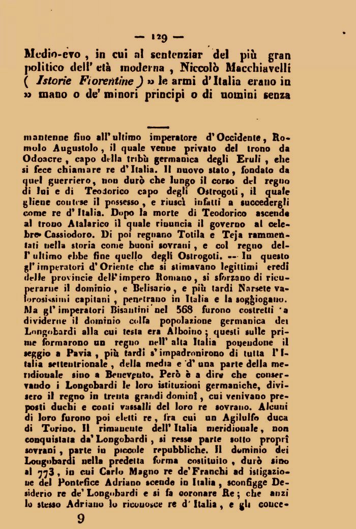 mantenne fiuo all'ultimo imperatore d'Occidente, Romolo Augustolo, il quale venne privato del trono da Odoacre v capo dtlla tribù germanica degli Eruli , che si fece chiamare re d*Italia. II nuovo stato, fondato da quel guerriero, non durò che lungo il corso del regno di lui e di Teodorico capo degli Ostrogoti, il quale gliene contese il possesso , e riuscì infatti a succedergli come re d' Italia. Dopo la morte di Teodorico ascenda al trono Atalarico il quale rinuncia il governo al celebre* Cassiodoro. Di poi regnano Totila e Teja rammeA-tati nella storia come buoni sovrani , e col reguo dell' ultimo ebbe fine quello degli Ostrogoti. — lu questo gl'imperatori d'Oriente che si stimavano legittimi eredi delle provincie dell-'impero Romano, si sforzano di ricuperarne il dominio , e Belisario, e più tardi Narsete valorosissimi capitani , penetrano in Italia e la soggiogano. Ma gl'imperatori Bisaulini nel 568 furono costretti 'a dividerne il dominio colla popolazione germanica dei Longobardi alla cui testa era Alboino ; questi sulle prime formarono un reguo nell' alta Italia polendone il seggio a Pavia, più tardi s'impadronirono di tutta l'Italia settentrionale , della media e d' una parte della meridionale sino a Benevento. Però è a dir* che conservando i Longobardi le loro istituzioni germaniche, divisero il regno in trenta grandi domini, cui venivano preposti duchi e conti vassalli del loro re sovrano. Alcuui di loro furono poi eletti re , ira cui un Agilulfo duca di Torino. Il rimanente dell' Italia meridionale, non conquistala da' Longobardi , si ressa parte sotto propri sovrani , parte iu piccole repubbliche. Il dominio dei Longobardi nella predelta forma costituito , durò sino al 773 9 in cui Carlo Magno re de'Franchi ad istigazione del Pontefice Adriano scende in Italia , sconfigge Desiderio re de' Longobardi e si fa coronare Re ; che anzi lo stesso Adriano lo riconosce re d'Italia , e gli conce*