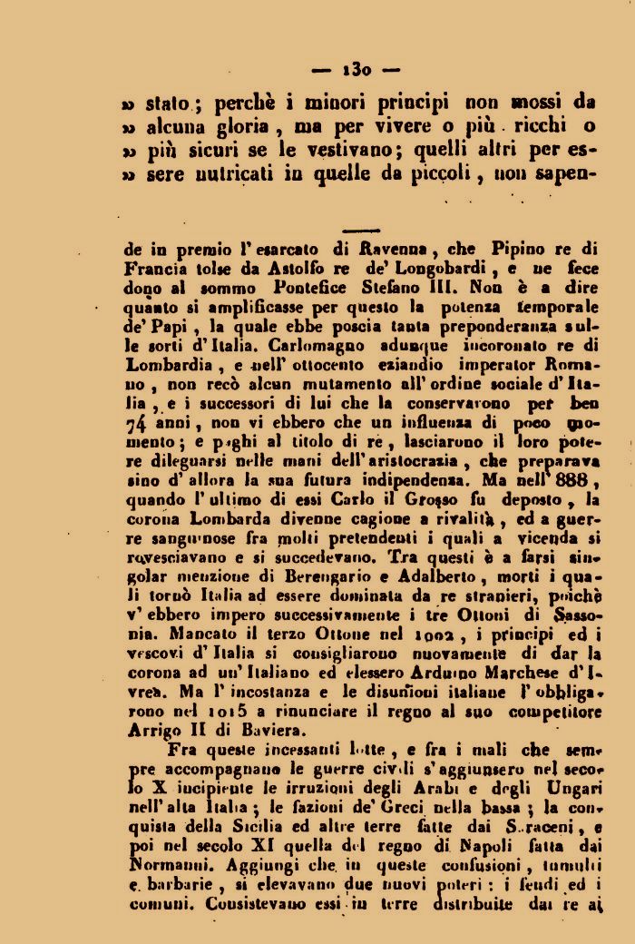do in premio 1' esarcato di Ravenna , che Pipino re di Francia tolse da Astolfo re de' Longobardi , e ne fece dono al sommo Pontefice Stetano HI. Non è a dire quaato si amplificasse per questo la potenza temporale de9 Papi , la quale ebbe poscia tanta preponderanza sulle sorti d' Italia. Carlomagao adunque incoronato re di Lombardia , e -Dell' ottocento eziandio irnperator Romano , non recò alcun mutamento all'ordine sociale d'Italia , e i successori di lui che la conservarono per ben 74 anni , non vi ebbero che un influenza di poco fomento ; e p'ghi al titolo di re, lasciarono il loro potere dileguarsi nelle mani dell' aristocrazia , che preparava sino d' allora la sua futura indipendenza. Ma nell 888 v quando l'ultimo di essi Carlo il Grosso fu deposto, la corolla Lombarda divenne cagione a rivalità , ed a guerre sanguinose fra molli pretendenti i quali a vicenda si rovesciavano e si succedevano. Tra questi è a farsi sin* golar menzione di Berengario e Adalberto, morti i quali tornò Italia ad essere dominata da re stranieri, poiché v' ebbero impero successivamente i tre Ottoni di Sassonia. Mancato il terzo Otioue nel looa , i principi ed i vescovi d'Italia si consigliarono nuovamente di dar la corona ad un' Italiano ed elessero Arduino Marchese d'Ivrea. Ma l'incostanza e le disunioni italiaue l'obbliga* rono nei io»5 a rinunciare il regno al suo competitore Arrigo II di Baviera.
