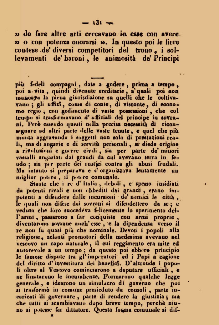 più fedeli compagni , date a godere , prima a tempo , poi a-vita , quindi divenute ereditarie, a'quali poi non mancala la piena giurisdizione su quelli che le coltivavano ; gli uffizi, come di conte, di visconte, di economo regio ^ con godimento di vaste possessioni , che col tempo si trasformavano d' uffiziali del principe in sovrani. Fero essendo questi ntlla precisa necessiti di ricou-segnare ad altri parte «Ielle vaste tenute, e quel che più monta aggravando i soggetti non solo di prestazioni rea-li, ma di angarie e di servitù personali , si' diede origine a rivoluzioni e guerre civili , sia per parte de9 minori vassalli angariati dai grandi da cui avevano terra in feudo ; sia per parte dei rustici contra gli abusi feudali. Ma intanto si preparava e organizzava lentamente un miglior potere , il patere comunale.