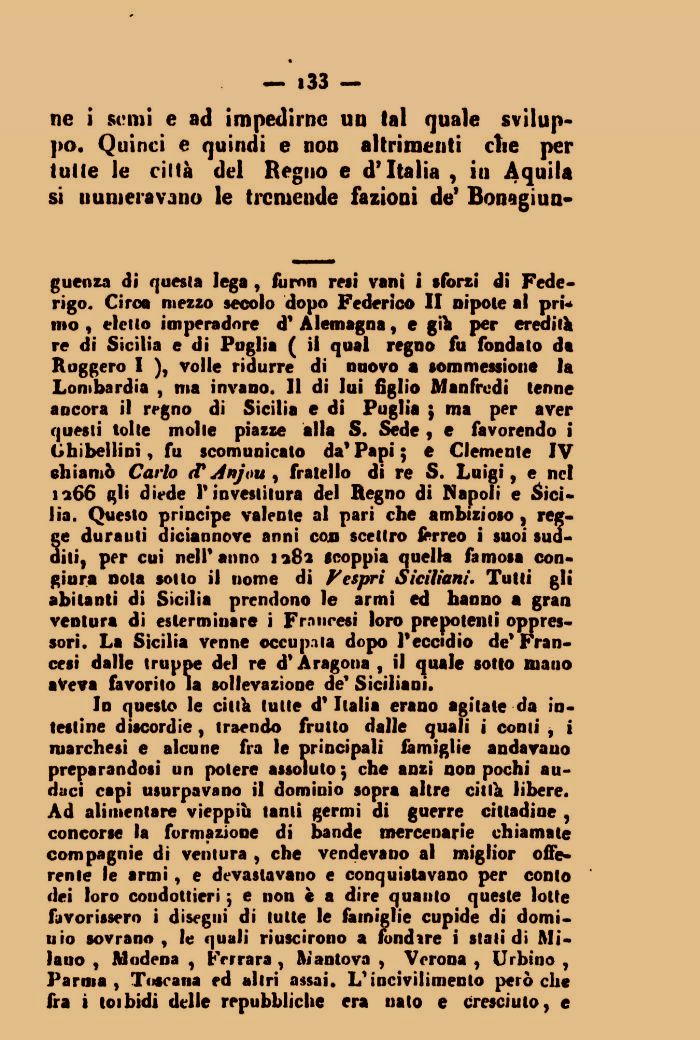 ne i semi e ad impedirne uu tal quale sviluppo. Quinci e quindi e non altrimenti ette per tulle le cillà del Regno e d'Italia , iu Aquila si numeravano le tremende fazioni de9 Bonagiuu-