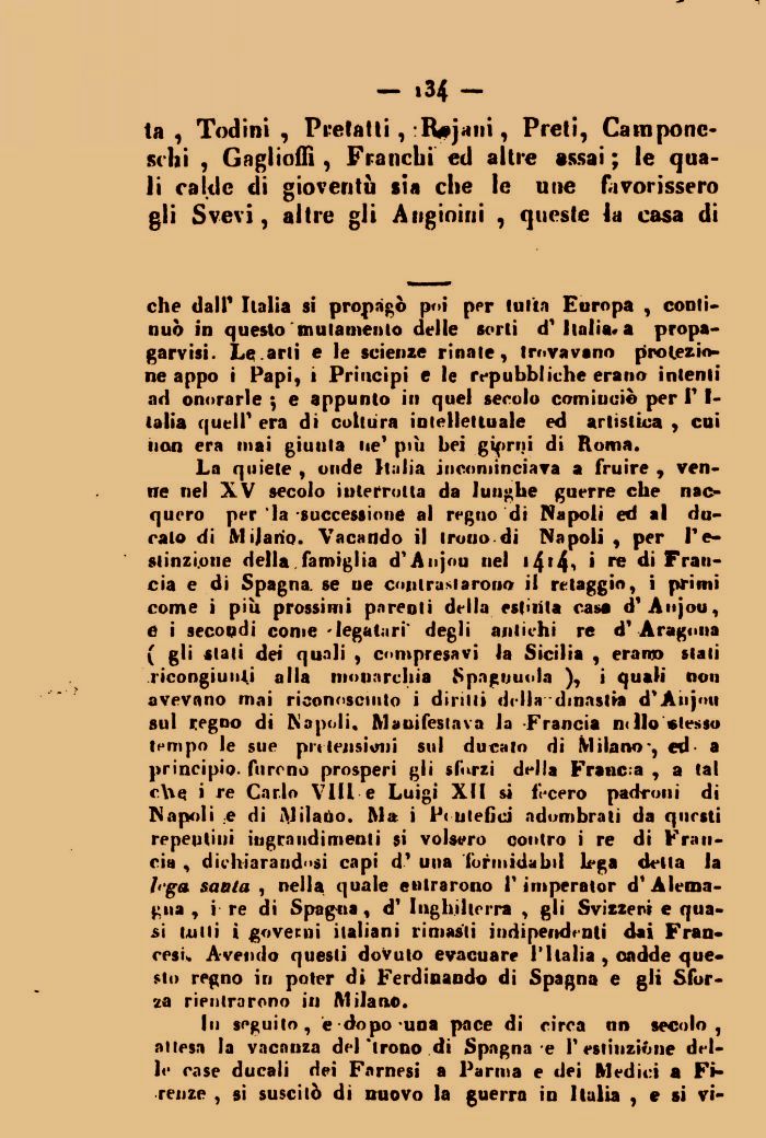 La quiete , onde Italia incominciava a fruire , venne nel XV secolo interrotta da luughe guerre che nacquero per la successione al reguo di Napoli ed al durato di Milano. Vacando il trono-di Napoli , per Fe-stinzi.oue della famiglia d'Anjou nel 14T' re di Francia e di Spagna, se ne coni rasi arono il retaggio, i primi come i più prossimi parenti della estinta casa d'Anjou, e i secondi come 'legatari' degli antichi re d' Aragona ( gli stati dei quali , compresavi la Sicilia , erano stali ricongiunti alla monarchia Spaguuola ), i quali non avevano mai riconosciuto i diritti della dinastia d'Anjou sul regno di Napoli. Manifestava la Francia n