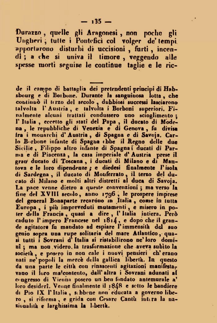Durazzo , quelle gli Aragonesi , non poche gli Ungheri • tulle i Pontefici col volger de'tempi apportarono disturbi dr uccisioni , furti , incendi ; a the si univa il timore , veggendo alle spesse morti seguiBe le continue taglie e le riccie il rampo di battaglia dei pretendenti principi di Hab-sbourg e di Boi bone. Durante la sanguinosa lotta , che continuò il tfrzo del secolo , dubbiosi successi lasciarono talvolta V Austria , e talvolta i Borboni superiori. Finalmente alcuni trattati condussero uno scioglimento ; 1' Italia , eccetto gli stati del Papa , il ducato di Modena » le repubbliche di Venezia e di Genova , fu divisa Ira i monarchi d1 Austria 9 di Spagna e di Savoja. Carlo Borbone infante di Spagna ebbe il Regno delle due Sicilie, Filippo altro infante di Spagnai ducati di Parma e di Piacenza , la casa imperiale d' Austria prese il gratf ducato di Toscana , i ducati di Milano e di Mantova e le loro dipendenze ; e diedesi finalmente l'isola di Sardegna , il ducato di Monferrato , il terzo del ducato di Milano e molti altri distretti al duca di Savoja. La pace venne dietro a queste convenzioni ; ma verso la fine del XVIII secolo, anno 1796 , le prospere imprese del geoeral Bonaparte recarono in Italia , come in tutta Europa , i più impreveduti mutamenti , e misero in poter della Francia , quasi a dire , l'Italia intiera. Però caduto P impero Francese nel 1814 ? e dopo che il grande agitatore fu mandato ad espiare P immensità del suo genio sopra uua rupe solitaria del mare Atlantico, quasi tutti i Sovrani d Italia si ristabilirono ne9 loro domini ; ma non videro, la trasformazione che aveva subito la società , e posero in non cale i nuovi pensieri eh' erano nati ne'popoli la mercè della gallica libertà. In questo da una parte le citta con rinascenti agitazioni manifestavano il loro malcontento, dall' altra i Sovrani adunati al congresso di Vienna posero un ben fondato antemurale a1 loro desideri. Venne finalmente il e 8C ,I° le bandiere