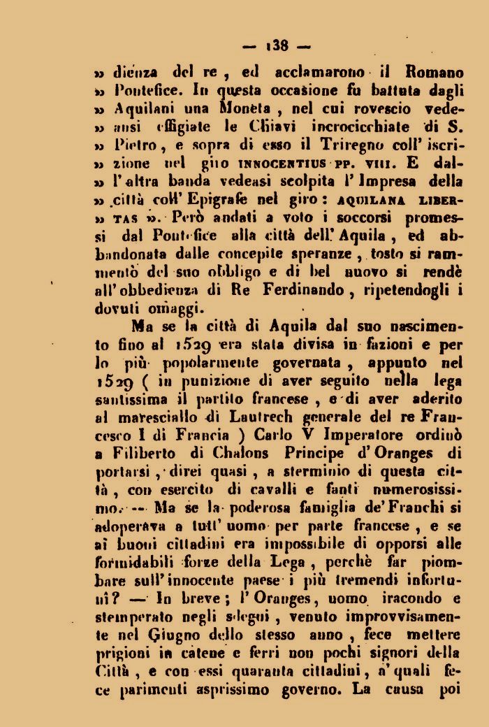 » ci lenza del re , ed acclamarono il Romano » Pontefice. In questa occasione fu battuta dagli » Aquilani una Monéta , nel cui rovescio vede-» ansi effigiate le Cliiavi incrocicchiate di S. » Pietro, e sopra di esso il Triregno coli' iscri-» zione nel giio tnnocertius pp. vili. E dal-» l'altra banda vedeasi scolpita l'Impresa della » città coli1 Epigrafe nel giro : aquilana liber-» tas ». Però andati a voto i soccorsi promessi dal Pontefice alla città dell9 Aquila , ed abbandonata dalle concepite speranze , tosto si rammento del suo obbligo e di bel nuovo si rendè all'obbedienza di Re Ferdinando, ripetendogli i dovuti omaggi.