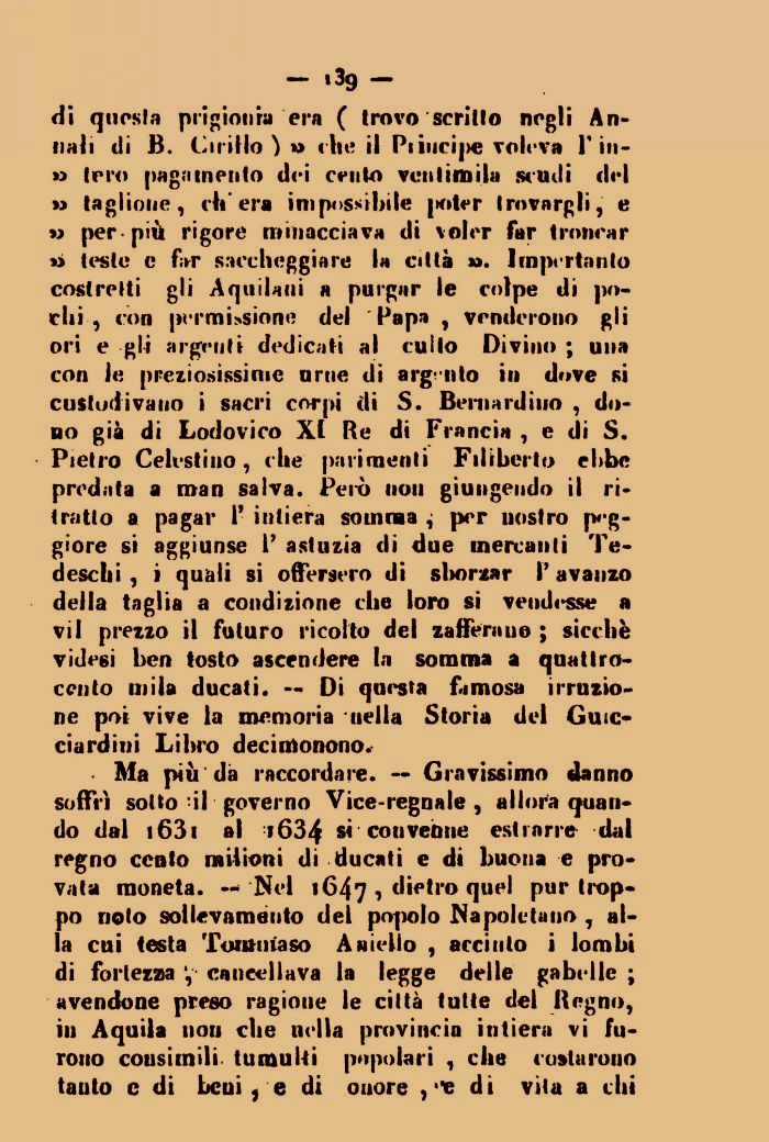 Ma più dà raccordare. — Gravissimo danno soffrì sotto-il governo Vice-regnale , allora quando dal i63t al f634 sì couvenne estrarle dal regno cento milioni di ducati e di buona e provata moneta. -- Nel 1647 ? dietro quel pur troppo noto sollevaménto del popolo Napoletano , alla cui testa Tommaso A niello , accinto i lombi di fortezza cancellava la legge delle gabelle ; avendone preso ragione le città tutte del Regno, in Aquila non che nella provincia intiera vi furono cousimili tumulti popolari , che costarono tanto e di beni , e di ouore di vita a chi