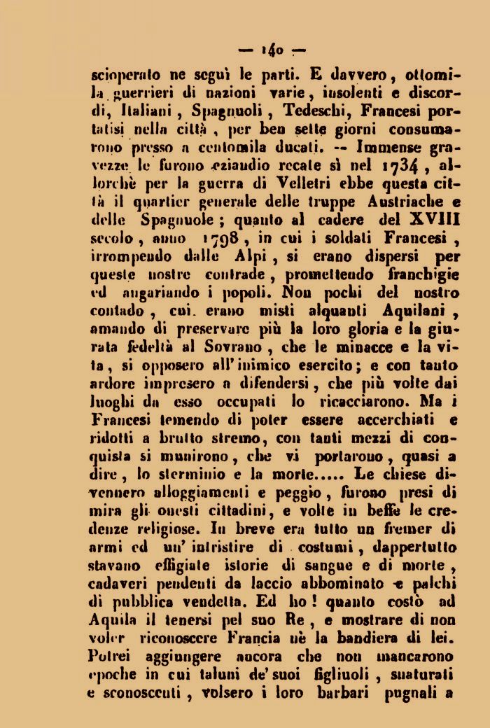 scioperalo ne segui le parti. E davvero, ottomila guerrieri di nazioni varie, insolenti e discordi, Italiani , Spagnuoli , Tedeschi, Francesi portatisi nella città , per ben sette giorni consumarono presso a centomila ducati. — Immense gravezze le furono .cziaudio recate sì nel 1734 , allorché per la guerra di Velletri ebbe questa città il quarlicr generale delle truppe Austriache e delle Spaglinole ; quanto al cadere del XVJII secolo , anno 1798 , in cui i soldati Francesi , irrompendo dalle Alpi , si erano dispersi per queste nostro contrade, promettendo franchigie ed angariando i popoli. Non pochi del nostro contado , cui. erano misti alquanti Aquilani , amando di preservare più la loro gloria e la giù* rata fedeltà al Sovrano , che le minacce e la vita , si opposero all'inimico esercito; e con tauto ardore impresero a difendersi, che più volte dai luoghi dn esso occupati lo ricacciarono. Ma i Francesi temendo di poter essere accerchiati e ridotti a bruito stremo, con tanti mezzi di conquista si munirono, che vi portarouo , quasi a dire , lo sterminio e la morie..... Le chiese divennero alloggiamenti e peggio, furono presi di mira gli onesti cittadini, e volle in beffe le ere* (lenze religiose. In breve era tulto un fremer d» «irmi ed uu' intristire di costumi, dappertutto stavano effigiate istorie di sangue e di morte , cadaveri pendeuti da laccio ahbominato e palchi di pubblica vendetta. Ed ho ! quanto costò ad Aquila il tenersi pel suo Re , e mostrare di non voler riconoscere Francia uè la bandiera di lei. Potrei aggiungere ancora che non mancarono epoche in cui taluni de'suoi figliuoli , snaturati e sconoscenti , volsero i loro barbari pugnali a
