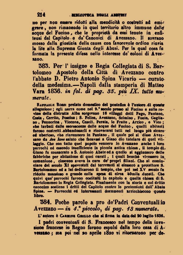 383. Per l'insigne e Regia Collegiata di Sk Bartolomeo Apostolo della Città di Avezzano contro l'abbate D. Pietro Antonio Spina Vicario — curato della medesima.—Napoli dalla stamperia di Matteo Vara 1836. in fol. di pag. 33. più IX. tutte numerate.
