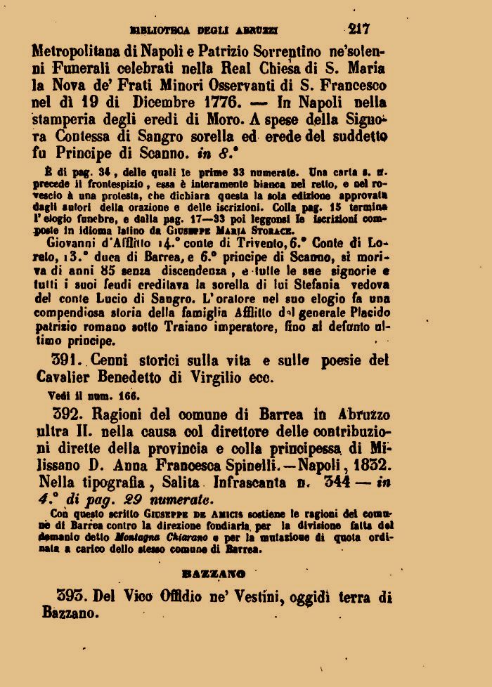 Giovanni d'Afflino 14..° conte di Trivento,6.9 Conte di Loreto, i3.° duca di Barrea, e 6.° principe di Scanno, si mori* va di anni 85 senza discendenza , e tutte le sue signorie e tulli i suoi feudi ereditava la sorella di lui Stefania vedova del conte Lucio di Sangro. L'oratore nel suo elogio fa una compendiosa storia della famiglia Afflitto d^l generate Placido patrizio romano sotto Traiano imperatore, fino al defonto ultimo prìncipe.