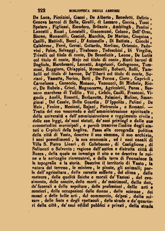 De Luca, Piccinini, Giacci, De Alberto, Benedetti, Delirio , Genova baroni di Salle, Girelli, di Lazzaro, Coccia, Tozzi, Spataro , Figliozzi, Escudero, follante, Amblingh, Pantioi, Lancetti , Ruzzi, Lucatelli, Giacomuzzi, Celano, Dell'Orso, Biscao, Monacelli, Cascioli, Macchia, De Marino, Cinquina , Casilli, Mattioli, Bucci, D'Antonello , Di Battista, Ciocchi, Calabrese, Ferri, Gerrai, Gottardo, Merlino, Ortenzio, Pado-vini, Polce, Selvaggi, Tirabosco , Tedeschini , Di Virgilio, Trivelli col titolo di conte, De Benediclis, Leone, De Lutiis col titolo di coote, Majo col titolo di conte, Muzii baroni di Dogliola, Marchesani, Laccetti, Angelucci, Codagnone, Tornitasi, Ruggiero, Chiappini, Monacelli, Roberti, Rulli, Tarn-belli col titolo di barone. De' Tiberii col titolo di conte, Su-riani, Vassetla, Norico, Betti , De Parma, Ciero, Caprioli , CameCusca , Canaccio, Monaco, Vannucci, Di Michele, Ricci, De Rubeis, Crisci, Magnacervo, Agricoletti, Panza , Bas-sano marchese di Tufillo , Viti, Cefalo, Casilli, Frasconi, Vi-gnola, Anelli, Rossetti, Barba rotta, Palmieri, Molino, Smargiassi , Del Cesale, Della Guardia, D'Ippolito, Palizzì , De Meis , Fenice , Meninni, Rajani, Pietrocola , e Romani. — Tratta del suo vescovado e dell'amministrazione spirituale , della università e dell'amministrazione e reggimento civile, delle sue leggi, de'suoi statuti, de'suoi privilegt e delle sue consuetudini municipali, e perciò trascrive l'indice degustatoli o Capitoli della bngliva. Passa alla corografia politica della città di Vasto, descrive il suo stemma, il suo archivio, i suoi possedimenti , la sua economia , ed i suoi casali di Villa S. Pietro Linari , di Collebuono , di Castiglione , di Salineoli o Solvento ; ragiona dell'antica e distrutta città di Bucca , della quale ne investiga il sito e ne descrive le mine e le anticaglie rinvenutevi, e della terra di Pennaluce fa la topografia e la storia. Descrive il territorio di Vasto, la natura del terreno, le miniere, le piante, gli animali; parla dell'agricoltura, delle carestie sofferte , del clima , delle meteore, delle qualità fisiche e morali de' Vastesi , del cen» simento, delle nascite, delle morti , de' matrimoni, delle doti, de'funerali e delle sepolture, delle professioni, delle arti e mestieri, delle occupazioni delle donne , delle scienze, dei musei e delle belle arti , del commercio, de'pesi, delle misure , delle feste e degli spettacoli , delle strade e de'quartie-ri della città, de' suoi edilizi pubblici e privati, della strada