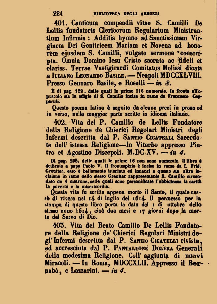 402. Vita del P. Camillo de Lellis Fondatore della Religione de Chierici Regolari Ministri degli Infermi descritta dal P. Santio Cicatelli Sacerdote dell' istessa Religione—In Viterbo appresso Pietro et Agostino Discepoli. M.DC.XV. — in 4.