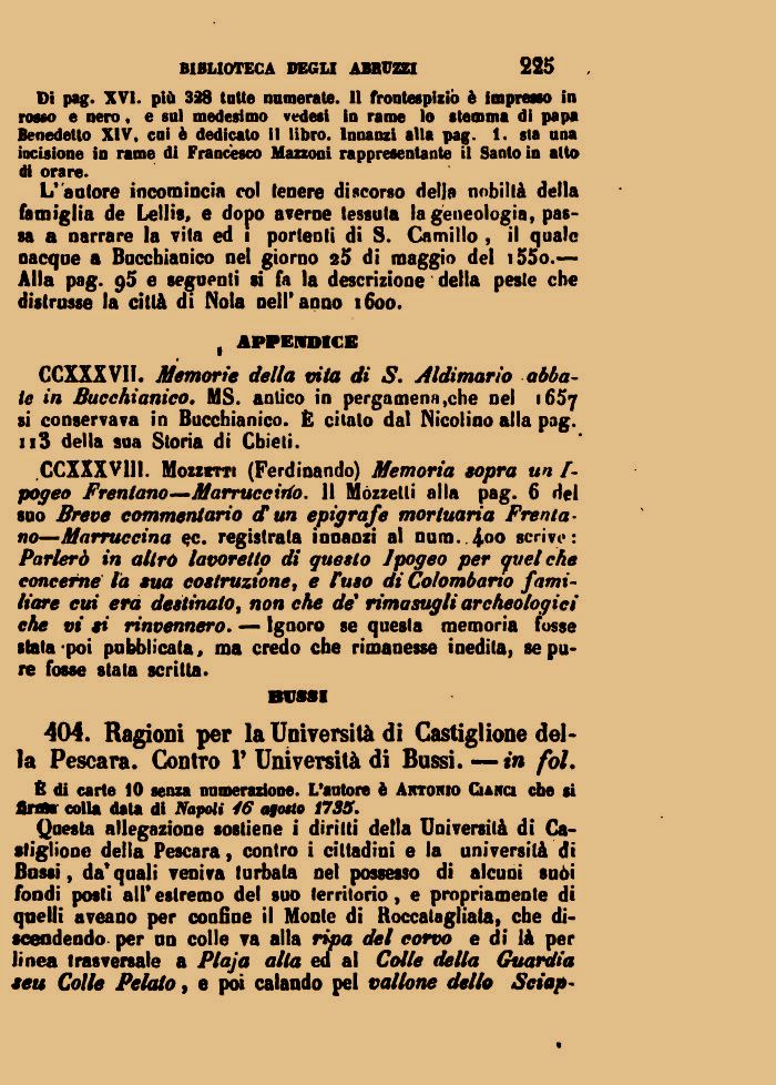 CCXXXVI1. Memorie della vita di S. Aldimario abbate in Bucchianico. MS. antico in pergamena,che nel 1657 si conservava in Bucchianico. È citalo dal Nicol ino alla pag. u3 della sua Storia di Cbieti.