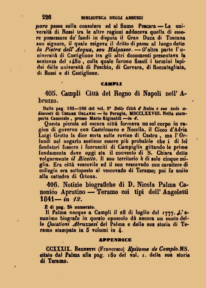 406. Notizie biografiche di D. Nicola Palma Canonico Aprutino — Teramo coi tipi dell' Angeletti 1841— in 12.