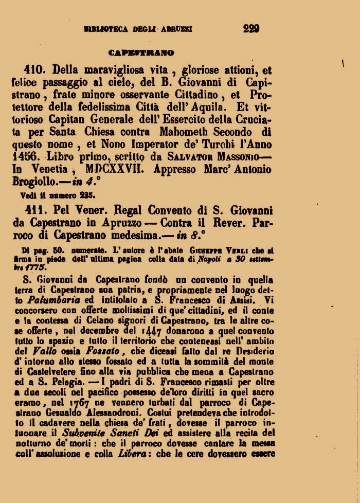 410. Della maravigliosa vita , gloriose attioni, et felice passaggio al cielo, del B. Giovanni di Capi-strano , frale minore osservante Cittadino, et Protettore della fedelissima Città dell'Aquila. Et vittorioso Capitan Generale dell' Essercito della Cruciala per Santa Chiesa contra Mahometh Secondo di questo nome , et Nono Imperator de' Turchi l'Anno 1456. Libro primo, scritto da Salvator Massonio— In Venetia , MDCXXVII. Appresso Marc' Antonio Brogiollo.—in 4