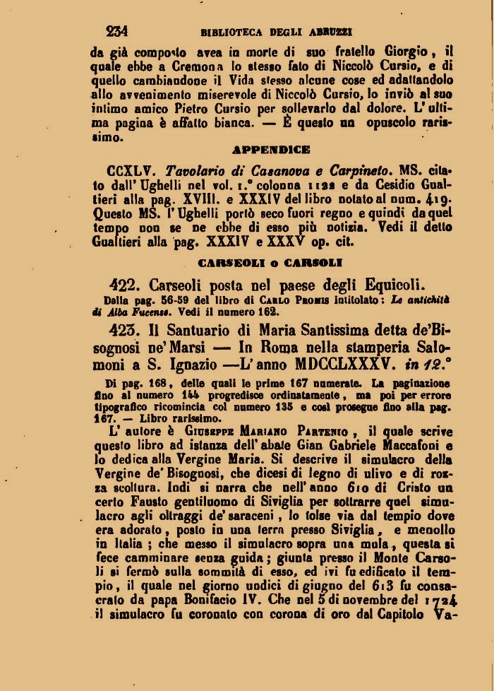 425. Il Santuario di Maria Santissima detta de'Bi-sognosi ne1 Marsi — In Roma nella stamperia Saio-moni a S. Ignazio —L'anno MDCCLXXXV. in 12.°