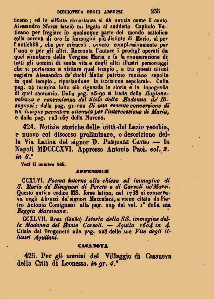 CCXLV1. Poema intorno alla chiesa ed immagine di S. Maria de' Bisognosi di Pereto 0 di Corsoli ne'Morsi. Queslo antico codice MS. forse Ialino, nel 1738 si conservava negli Abruzzi da'signori Maccafani, e viene citato da Pie* tro Antonio Corsignani alla pag. 229 del voi. della sua Reggia Morsicano.