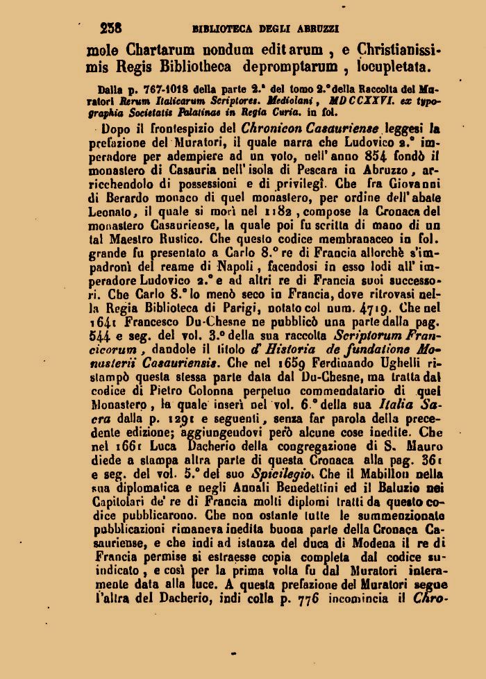 Dopo il frontespizio del Chronicon Casauriense \egges\ la prelazione del Muratori, il quale narra che Ludovico s.° im-peradore per adempiere ad un voto, nell'anno 854 fondò il monastero di Casauria nell'isola di Pescara in Abruzzo, arricchendolo di possessioni e di privilegi. Che fra Giovanni di Berardo monaco di quel monastero, per ordine dell'abate Leonato, il quale si morì nel 1182 , compose la Cronaca del monastero Casaurieose, la quale poi fu scritta di mano di un tal Maestro Rustico. Che queslo codice membranaceo io fol. grande fu presentato a Carlo 8.° re di Francia allorché s'impadronì del reame di Napoli, facendosi in esso lodi all' im-peradore Ludovico 2.°e ad altri re di Francia suoi successori. Cbe Carlo 8.° lo menò seco in Francia, dove ritrovasi nella Regia Biblioteca di Parigi, notato col num. 47»9- Che nel i64t Francesco Du-Chesne ne pubblicò una parte dalla pag. 544 e seg» del 3.® della sua raccolta Scripiorum Frati-cicorum , dandole il titolo d Bistorta de fundaiìone Mollasi erii Casauriensis. Che nel 1659 Ferdinando Ughelii ristampò questa stessa parte data dal Du-Chesne, ma tratta dal codice di Pietro Colonna perpetuo commendatario di quei Monastero, la quale inserì nel voi. 6°della sua Italia Sacra dalla p. 1291 e seguenti, senza far parola della precedente edizione; aggiungeudovi però alcune cose inedite. Che nel 166 r Luca Dacherio della congregazione di S. Mauro diede a slampa altra parte di questa Cronaca alla pag. 361 e seg. del voi. 5.° del suo Spicilegio<, Che il Mabilloti nella sua diplomatica e negli Annali Benedettini ed il Baluzio nei Capitolari de* re dì Francia molti diplomi tratti da questo codice pubblicarono. Cbe non ostante tutte le summenzionato pubblicazioni rimaneva inedita buona parte della Cronaca Casauriense, e che indi ad istanza del duca di Modena il re di Francia permise si estraesse copia completa dal codice suindicato , e così per la prima volta fu dal Muratori interamente data alla luce. A questa prefazione del Muratori segue l'altra del Dacherio, indi colla p. 776 incomincia il Chro-