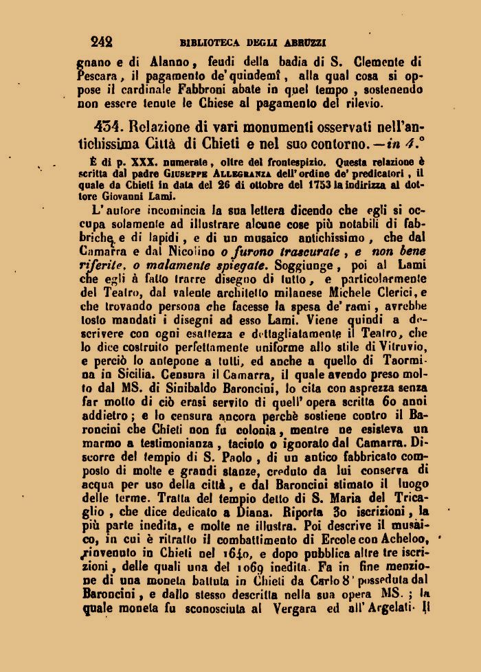 L'autore incomincia la sua lettera dicendo che egli si occupa solamente ad illustrare alcune cose più notabili di fabbriche e di lapidi, e di un musaico antichissimo , che dal Camarra e dal Nicoiino o furono trascurate , e non bene riferite, o malamente spiegale. Soggiunge, poi al Lami che egli à fatto trarre disegno di tutto , e particolarmente del Teatro, dal valente architetto milanese Michele Clerici, e che trovando persona che facesse la spesa de' rami, avrebbe tosto mandati i disegni ad esso Lami. Viene quindi a descrivere con ogni esattezza e dettagliatamente il Teatro, che lo dice costruito perfettamente uniforme allo stile di Vitruvio, e perciò Io antepone a tutti, ed anche a quello di Taormina in Sicilia. Censura il Camarra, il quale avendo preso molto dal MS. di Sinibaldo Baroncini, lo cita con asprezza senza far molto di ciò erasi servito di quell' opera scritta 60 anni addietro ; e lo censura ancora perchè sostiene contro il Baroncini che Chieti non fu colonia, mentre ne esisteva un marmo a testimonianza , taciuto o irato dal Camarra. Discorre del tempio di S. Paolo , di un antico fabbricato composto di molte e grandi stanze, creduto da lui conserva di acqua per uso della città, e dal Baroncini stimato il luogo delle terme. Traila del tempio dello di S. Maria del Trica-glio , che dice dedicato a Diana. Riporta 3o iscrizioni, la più parte inedita, e molte ne illustra. Poi descrive il musàico, in cui è ritratto il combattimento di Ercole con Acheloo, ' /invenuto in Chieti nel 164.0, e dopo pubblica altre tre iscrizioni , delle quali una del 1069 inedita. Fa in (ine menzione di una moneta battuta in Chicli da Carlo 8' posseduta dal Baroncini, e dallo stesso descritta nella sua opera MS. ; la quale moneta fu sconosciuta al Yergara ed all' Argelati- Il