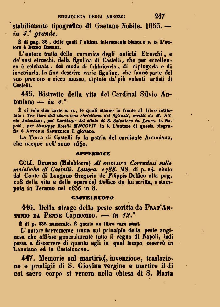 CCLI. Dblfico (Melchiorre) Al ministro Corradini sulle maioliche di Castelli. Lettera. fj88. MS. di p. 24.. citato dal Conte di Longano Gregorio de Filippis Delfico alla pag. 118 della vita e delle opere del Delfico da lui scritta, e stampata in Teramo nel i836 in 8.