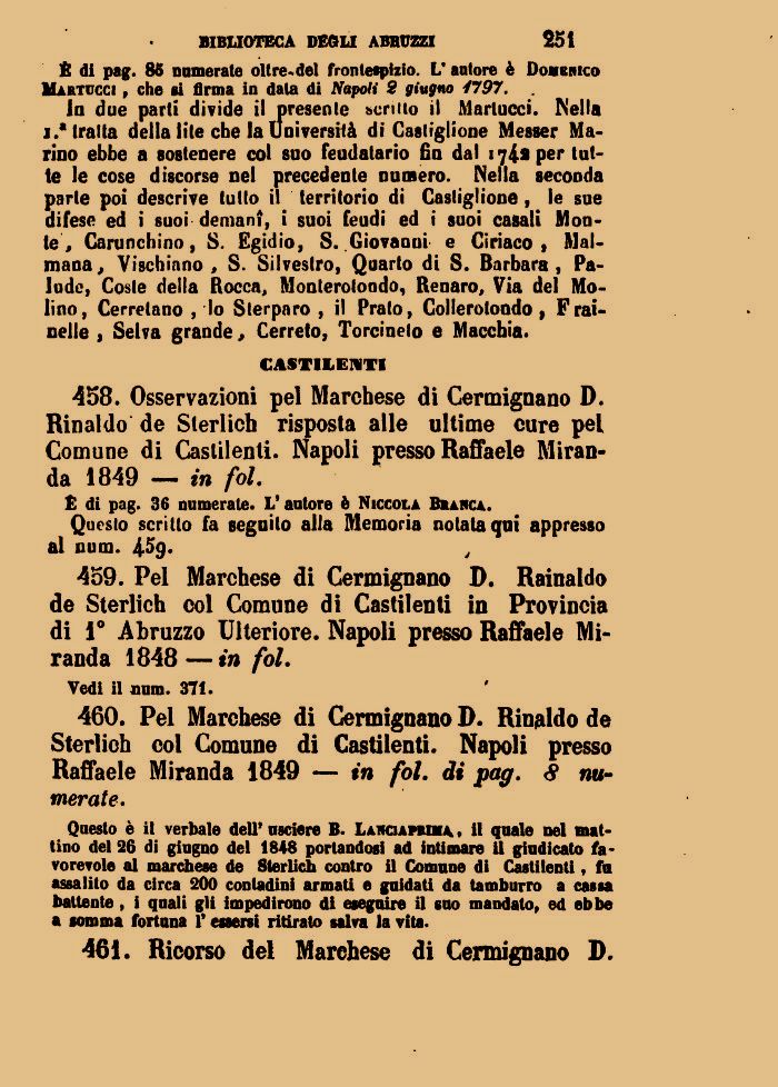 460. Pel Marchese di Cermignano D. Rinaldo de Sterlich col Comune di Castilenti. Napoli presso Raffaele Miranda 1849 — in fol. di pag. <9 numerate.