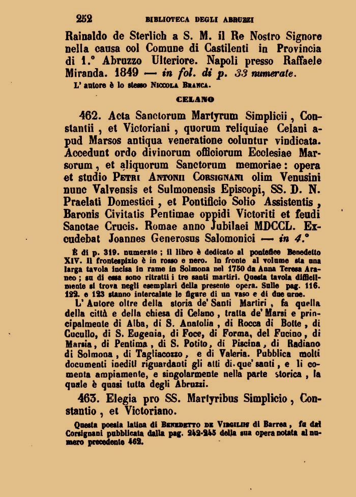 462. Acta Sanclorum Martyrum Simplicii, Constantii , et Victoriani , quorum reliquiae Celani a-pud Marsos antiqua veneratione coluntur vindicata. Accedunt ordo divinorum officiorum Ecclesiae Mar-sorum, et aliquorum Sanctorum memoriae : opera et studio Petri Antonii Corsignani olim Venusini nunc Valvensis et Sulmonensis Episcopi, SS. D. N. Praelati Domestici , et Pontificio Solio Assistentis , Baronis Civitatis Pentimae oppidi Victoriti et feudi Sanotae Crucis. Romae anno Jubilaei MDCCL. Ex-cudebat Joannes Generosus Salomonici — in 4.°