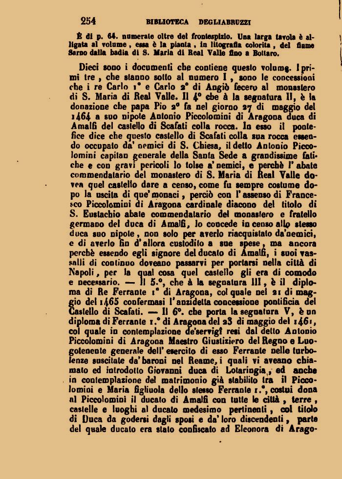 Dieci sodo i documenti che contiene questo volumg. {primi tre , che stanno sotto al numero I , sono le concessioni che i re Carlo i° e Carlo a° di Angiò fecero al monastero di S. Maria di Real Valle. Il 4° che à la segnatura II, è la donazione che papa Pio a° fa nel giorno 27 di maggio del i464 a suo nipote Antonio Piccolomini di Aragona duca di Amalfi dei castello di Scafati colla rocca. In esso il pontefice dice che questo castello di Scafati colla sua rocca essendo occupato da' nemici di S. Chiesa, il detto Antonio Piccolomini capitan generale della Santa Sede a grandissime fisti* che e con gravi pericoli lo tolse a* nemici, e perchè l'abate commendatario del monastero di S. Maria di Beai Valle do* vea quel castello dare a censo, come fu sempre costume dopo la uscita di que' monaci, perciò con l'assenso di Francesco Piccolomini di Aragona cardinale diacono del titolo di S. Eustachio abate commendatario del monastero e fratello germaoo del duca di Amalfi, lo concede in censo allp stesso duca suo nipote, non solo per averlo riacquistato da'oemici, e di averlo fin d'allora custodito a sue spese, ma ancora perchè essendo egli signore del ducato di Amalfi, i suoi vassalli di continuo doveano passarvi per portarsi nella città di Napoli, per la qua! cosa quel castello gli era di comodo e necessario. — Il 5.°, che à la segnatura HI, è il diploma di Re Ferrante i° di Aragona, col quale nel 21 di maggio del 1/^65 confermasi 1* anzidetta concessione pontificia del Castello di Scafali. — Il 6°. che porta la segnatura V, è un diploma di Ferrante i.° di Aragona del a3 di maggio del i46i, col quale in contemplazione de'servigf resi dal detto Aotonio Piccolomini di Aragona Maestro Giustiziera del Regno e Luogotenente generale dell' esercito di esso Ferrante nelle turbolenze suscitate da'baroni nel Reame, i quali vi aveano chiamato ed introdotto Giovanni duca di Lotaringia , ed anche in contemplazione del matrimonio già stabilito tra il Picco• lomini e Maria figliuola dello stesso Ferrante r.°, costui dona al Piccolomini il ducato di Amalfi con tutte le città , terre , castelle e luoghi a) ducato medesimo pertinenti, col titolo di Duca da godersi dagli sposi e da' loro discendenti, parte del quale ducato era stato confiscato ad Eleonora di Arago-