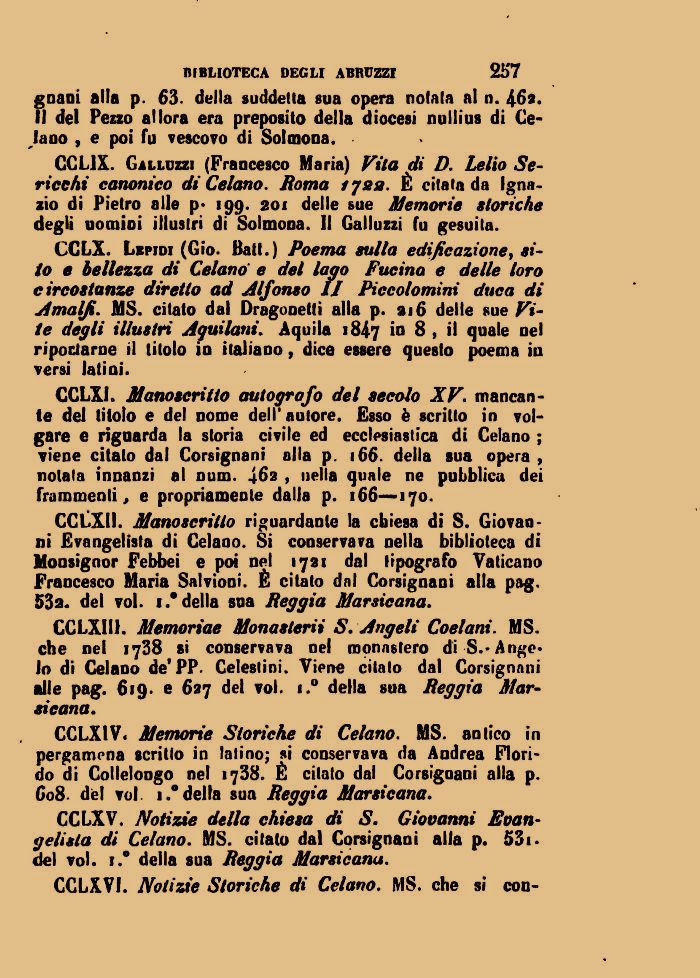 CCLXIV. Memorie Storiche di Celano. MS. antico in pergamena scritto in latino; si conservava da Andrea Florido di Collelongo nel 1738. Č citato dal Corsigoani alla p. g08. dči voi. i.° della sua Reggia Morsicano.