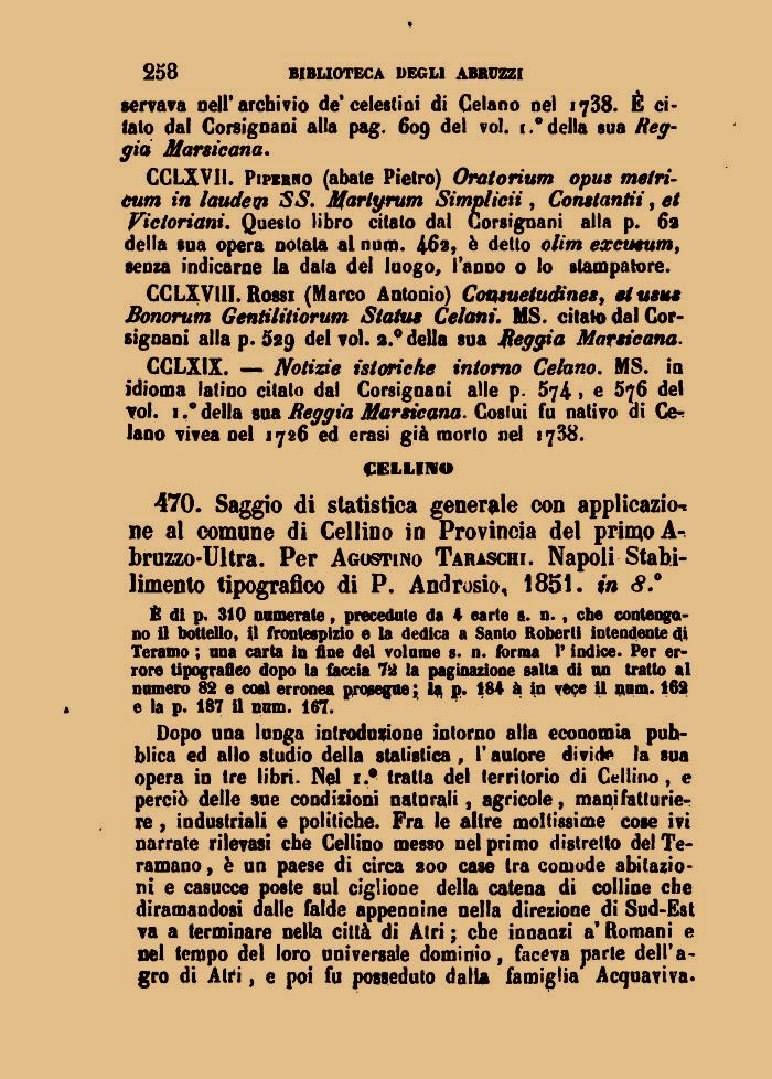 470. Saggio di statistica generale con applicazio-c ne al comune di Cellino in Provincia del primo A-bruzzo-Ultra. Per Agostino Taraschi. Napoli Stabilimento tipografico di P. Androsio, 1851. in <9.°