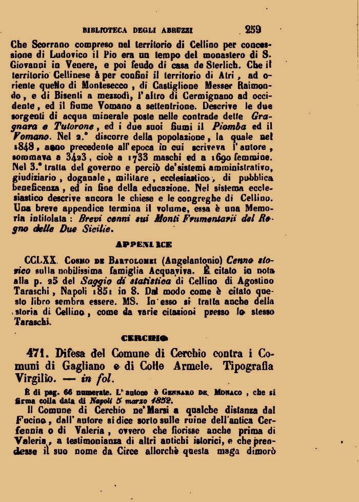 Che Scorrano compreso nel territorio di Cellino per concessione di Ludovico il Pio era no tempo del monastero di S. Giovanni io Venere, e poi feudo di casa de Sterlich. Cbe il territorio Gellinese è per confini il territorio di Atri , ad o-riente quello di Montesecco , di Castiglione Messer Raimondo, e di Bisenti a mezzodì, l'altro di Cermignano ad occidente , ed il fiume Vomano a settentrione. Descrive le due sorgeoti di acqua minerale poste nelle contrade dette Gra-gnara e Tutorone, ed i due suoi fiumi il Piomba ed il Fontano. Nel a.° discorre della popolazione, la quale net >848, atoo precedente all' epoca in cui scriveva I autore , sommava a 34-23, cioè a 1733 maschi ed a 1690 femmine. Nel 3.* tratta del governo e perciò de'sistemi amministrativo, giudiziario, doganale, militare , ecclesiastico; di pubblica beneficenza , ed in fine della educazione. Nel sistema ecclesiastico descrive ancora le chiese e le congreghe di Cellino. Una breve appendice termina il volume, essa è una Memoria intitolala : Brevi cenni sui Monti Frumentoni del Regno delle Due Sicilie.