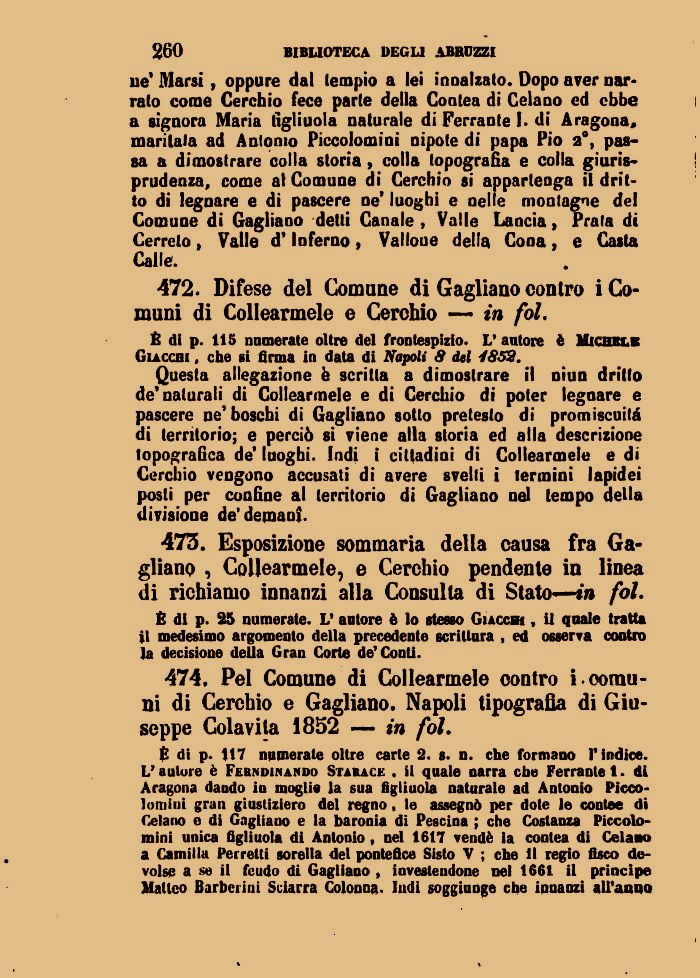 474, Pel Comune di Collearmele contro i. comuni di Cerchio e Gagliano. Napoli tipografìa di Giuseppe Colavita 1852 — in fol.