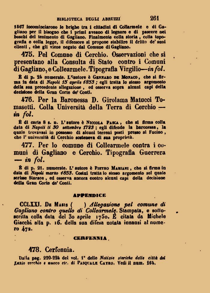 475. Pel Cornane di Cerchio. Osservazioni che si presentano alla Consulta di Stato contro i Comuni di Gagliano, e Collearmele. Tipografia Virgilio—in fol.