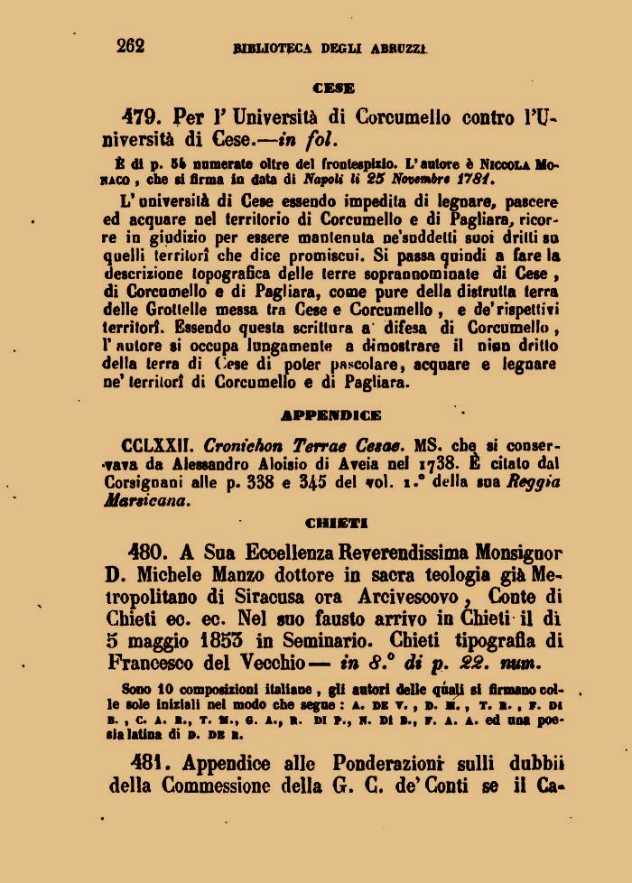 480. A Sua Eccellenza Reverendissima Monsignor D. Michele Manzo dottore in sacra teologia già Metropolitano di Siracusa ora Arcivescovo, Conte di Cbieti ec. ec. Nel suo fausto arrivo in Chieti il dì 5 maggio 1855 in Seminario. Chieti tipografia di Francesco del Vecchio— in <9.° di p. 22. num.