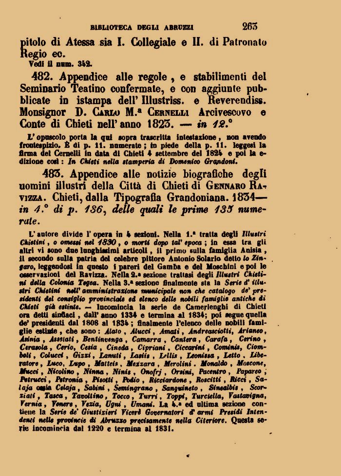 485. Appendice alle notizie biografiche degli uomini illustri della Città di Chieti di Gennaro Ratizza. Chieti, dalla Tipografia Grandoniana. 1834— in 4.° di p. 486, delle quali le prime 4 SS numerate.