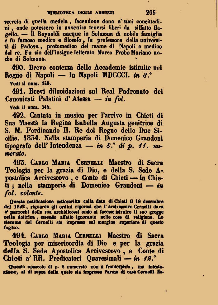 495. Carlo Maria Cernelli Maestro di Sacra Teologia per la grazia di Dio, e della S. Sede A-postolica Arcivescovo , e Conte di Chieti — In Chieti ; nella stamperia di Domenico Grandoni — in fol. volante.