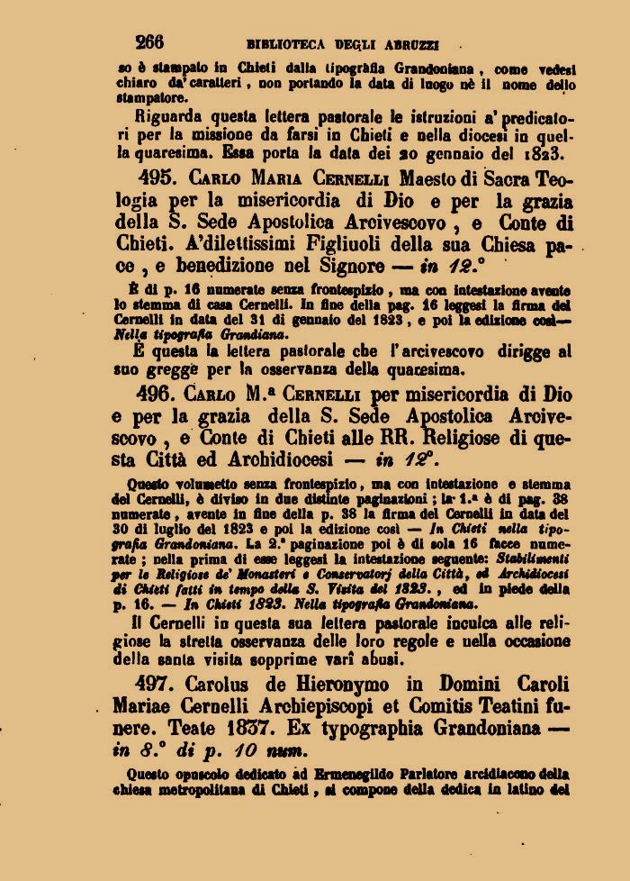 497. Carolus de Hieronymo in Domini Caroli Mariae Cernelli Archiepiscopi et Comitis Teatini funere. Teate 1837. Ex typographia Grandoniana — in .° di p. 10 num.