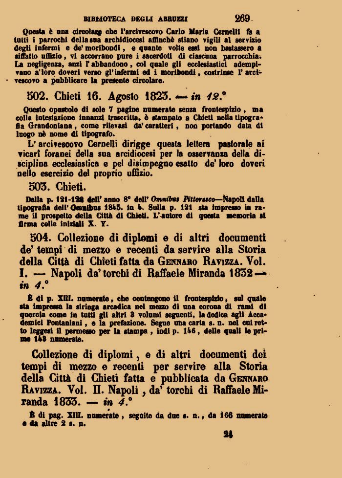 Collezione di diplomi, e di altri documenti dei tempi di mezzo e recenti per servire alla Storia della Città di Chieti fatta e pubblicata da Gennaro Ravizza. Voi. II. Napoli, da' torchi di Raffaele Miranda 1833. — in 4