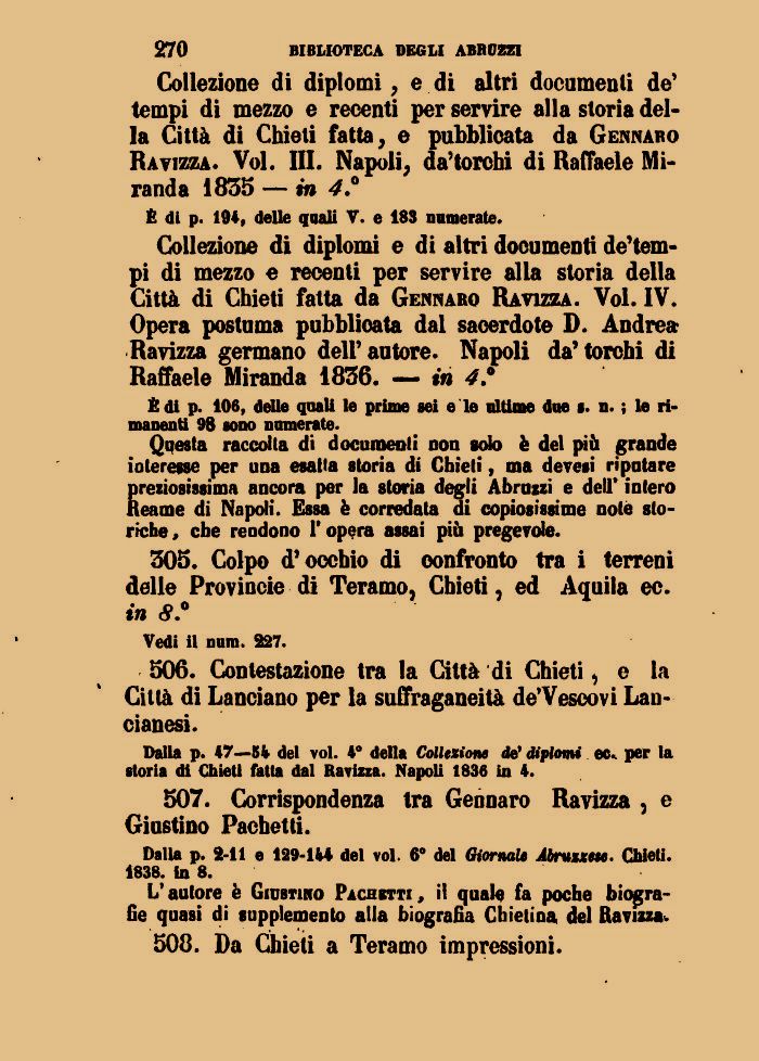 Collezione di diplomi e di altri documenti de'tem-pi di mezzo e recenti per servire alla storia della Città di Chieti fatta da Gennaro Ratizza. Voi. IV. Opera postuma pubblicata dal sacerdote D. Andrea Ravizza germano dell'autore. Napoli da'torchi di Raffaele Miranda 1836. — in 4.°