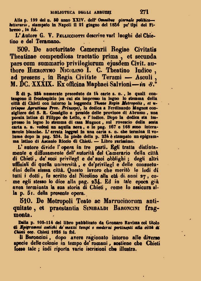 509* De auctoritate Camerarii Regiae Civitatis Tlieatinae compendiosa traotatio prima , et secunda pars cum summario privilegiorum ejusdem Civit. au-thore Hieronymo NiColino I. C. Tbeatioo Iudice , ad presens ; in Regia Civita te Terami — A sculi , M. DC. XXXIX. Ex officina Maphaei Salvioni—in