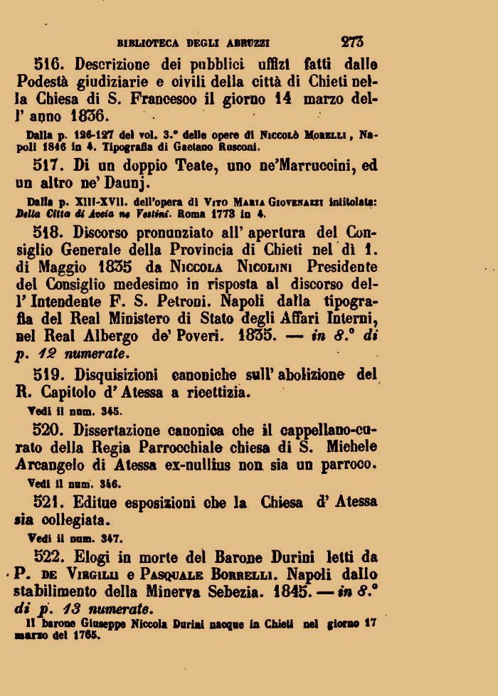 518. Discorso pronunziato all' apertura del Consiglio Generale della Provincia di Chieti nel dì 1. di Maggio 1835 da Niccola Nicolini Presidente del Consiglio medesimo in risposta al discorso dell' Intendente F. S. Petroni. Napoli dalla tipografia del Real Ministero di Stato degli Affari Interni, nel Real Albergo do' Poveri. 4835. — in di p. 12 numerate.