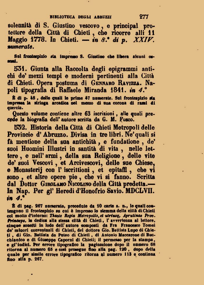 532. Historia della Città di Chieti Metropoli delle Provincie d'Abruzzo. Divisa in tre libri. Ne* quali si fà meri t ione della sua antichità, e fundatione , de' suoi Huomini Illustri in santità di vita , nelle lettere , e nelP armi, della sua Religione, delle vite de' suoi Vescovi, et Arcivescovi, delle sue Chiese, e Monasteri] con V iscrizioni, et epitaffi , che vi sono, et altre opere pie, cbe vi si fanno. Scritta dal Dottor Girolamo Nicolino della Città predetta.—